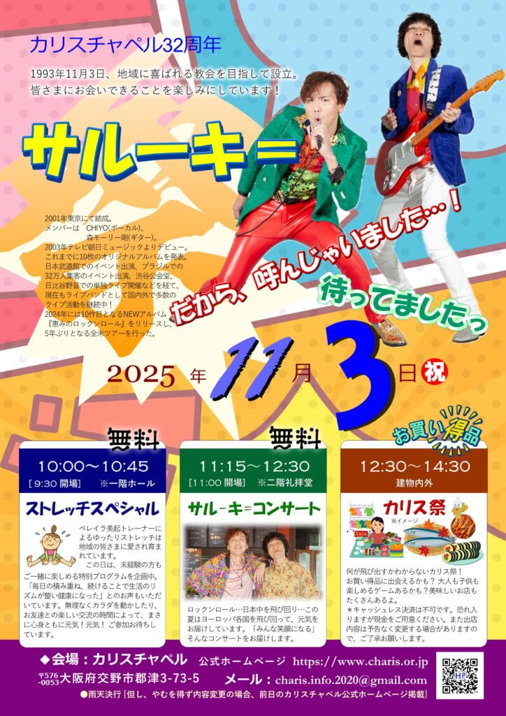 カリスチャペル32周年「サルーキ=コンサート・カリス祭」のご案内 投稿日 2025年9月5日 著者 カリスチャペル カテゴリー お知らせ 2025年11月3日、ゲストにサルーキ=をお迎えしてコンサートが開催されます。コンサートの他にもトレーナーによるストレッチや、カリス祭など、内容盛りだくさんで開催されます。参加は無料です。ぜひご参加ください。